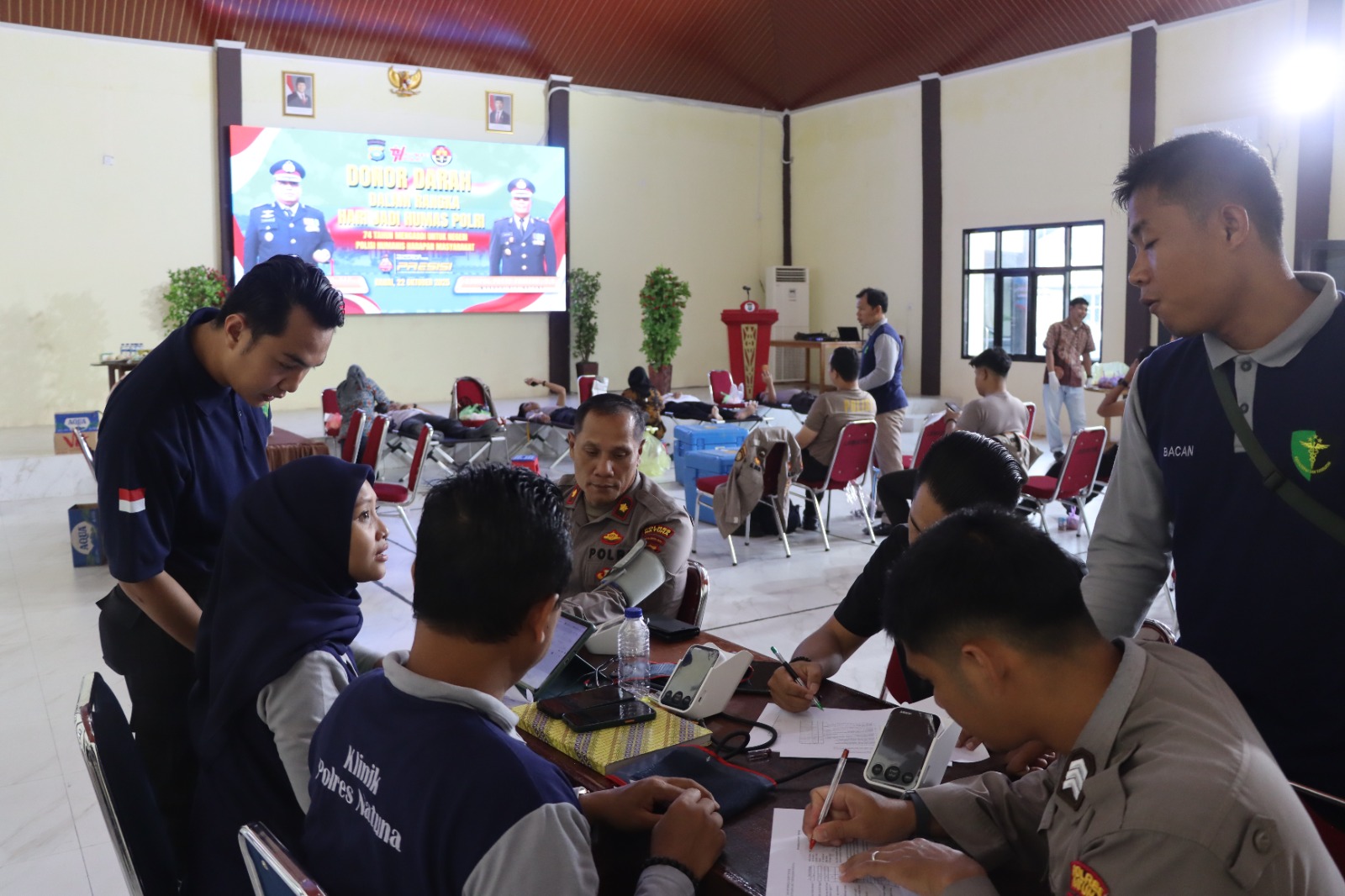 www.ranaipos.com _Natuna : Dalam rangka memperingati Hari Jadi Humas Polri ke-74 yang mengusung tema “74 Tahun Mengabdi untuk Negeri, Polisi Humanis Harapan Masyarakat,” Polres Natuna bersinergi dengan RSUD Natuna menggelar kegiatan donor darah sebagai bentuk kepedulian sosial dan sinergitas, Rabu, (22/10).