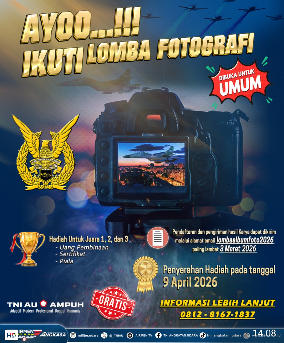 Natuna_ranaipos.com : Dalam rangka memperingati Hari Ulang Tahun (HUT) ke-80 Tentara Nasional Indonesia Angkatan Udara tahun 2026, Tentara Nasional Indonesia Angkatan Udara (TNI AU) menggelar lomba fotografi tingkat Nasional yang terbuka untuk seluruh Warga Negara Indonesia (WNI).