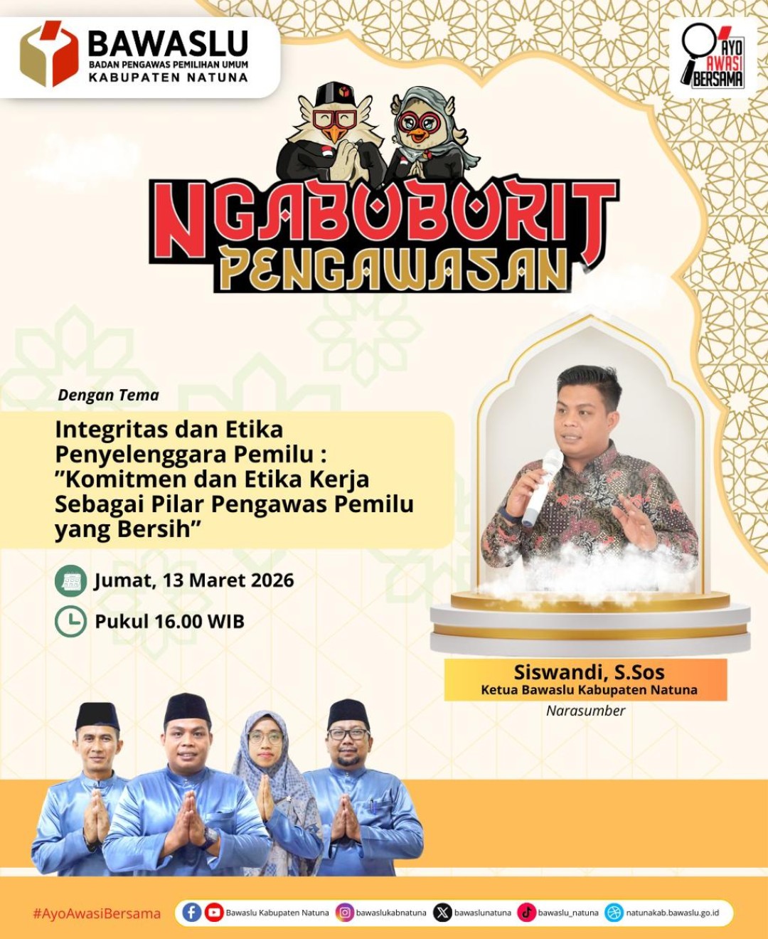 Ketua Bawaslu Kabupaten Natuna, Siswandi, S.Sos, mengatakan kegiatan Ngabuburit Pengawasan sebelumnya telah dilaksanakan secara bertahap sejak 24 Februari 2026 lalu, dengan berbagai tema yang berkaitan dengan penguatan kapasitas serta integritas pengawas pemilu.
