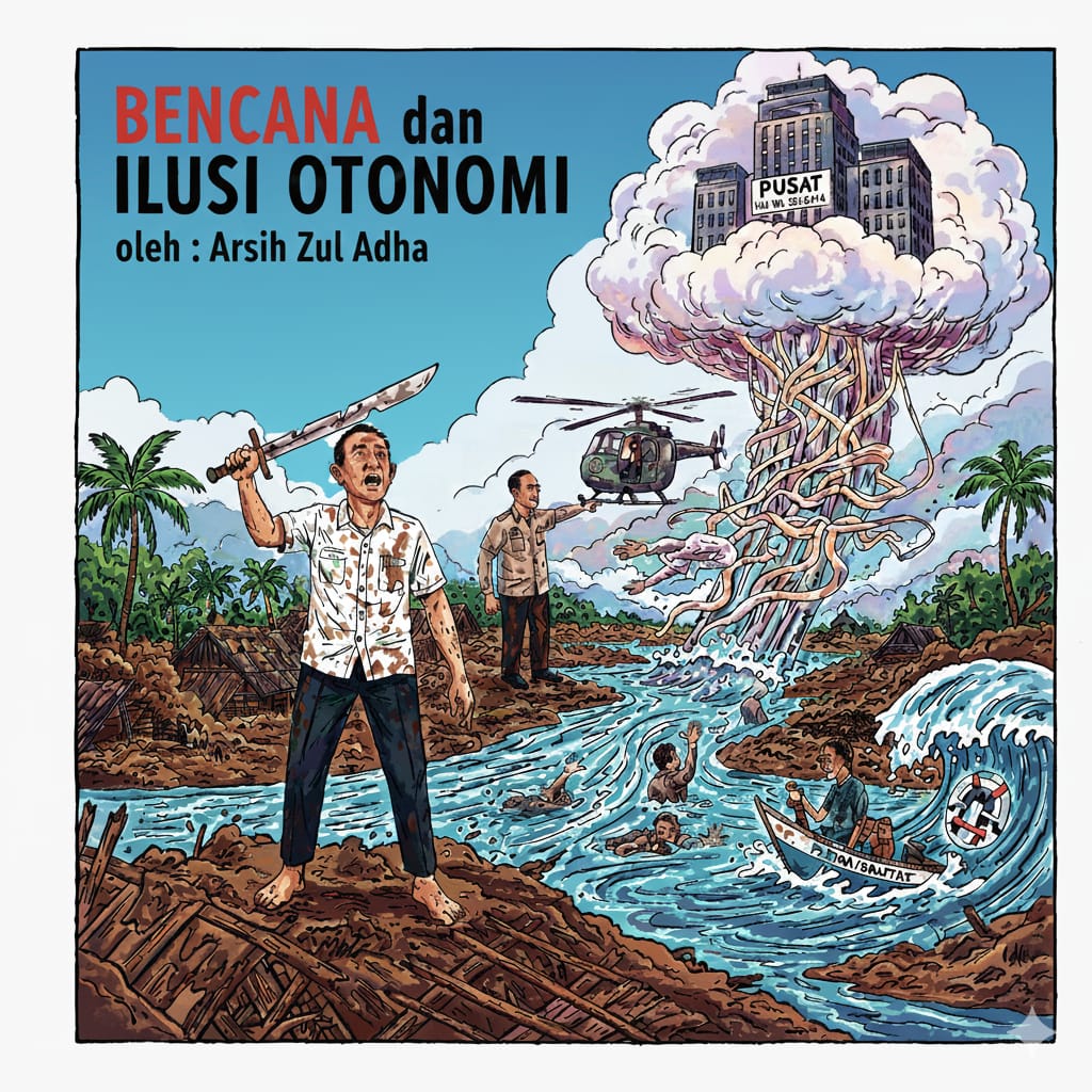 KETIKA lumpur bah menutup atap rumah di Sumatera Barat, Sumatera Utara, dan Aceh, yang tersisa bukan hanya puing, melainkan juga keputusasaan birokrasi. Di hadapan bencana raksasa itu, para bupati tak lebih dari penonton yang dipaksa menjadi panglima perang tanpa senjata. Mereka menyerah, gubernur terlambat tiba, dan pusat masih berkutat dengan definisi kewenangan. Sementara perdebatan administratif berlangsung, rakyat di bawah hanyut ditelan arus, korban dari desain otonomi yang setengah hati.
