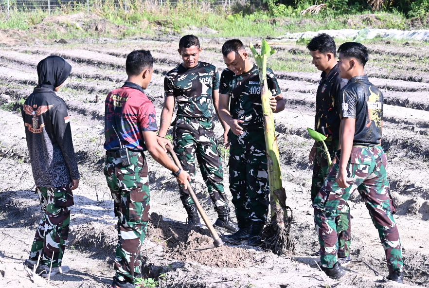 www.ranaipos.com _ Natuna : Sebagai bagian dari Program Optimalisasi Lahan Ketahanan Pangan, Pangkalan TNI AU Raden Sadjad (Lanud RSA) Natuna melaksanakan kegiatan penanaman bibit pisang di area RSA Farm, Lanud RSA, Kabupaten Natuna, Provinsi Kepulauan Riau, Senin (28/4/2025).