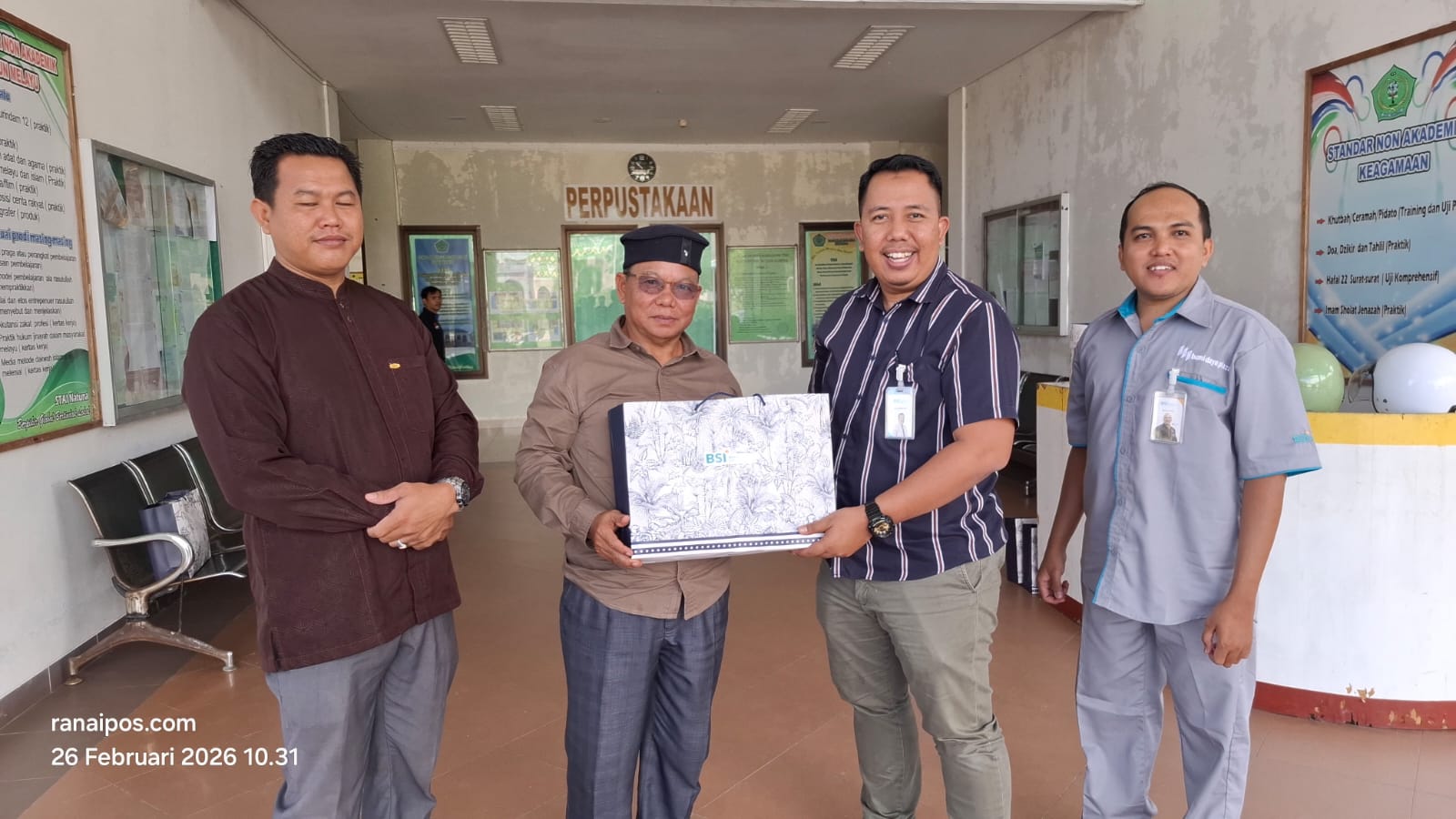 Natuna _ ranaipos.com : Bank Syariah Indonesia(BSI) Cabang Natuna menyalurkan wakaf berupa Al-Qur’an dan seperangkat alat shalat untuk mendukung kegiatan Safari Ramadan mahasiswaSekolah Tinggi Agama Islam Natuna (STAI Natuna), Rabu (26/2/2026) pagi di Ranai.