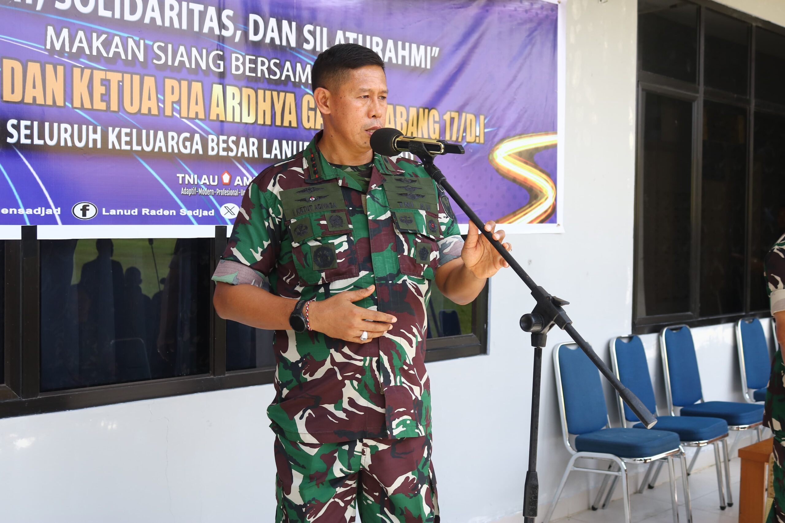 Turut hadir Ketua PIA Ardhya Garini Cabang 17/D.I Lanud RSA, Ny. Dewi I Ketut Adiyasa, bersama keluarga besar Lanud RSA. Suasana kebersamaan terlihat hangat dengan partisipasi personel militer, pegawai negeri sipil, hingga anggota PIA Ardhya Garini.