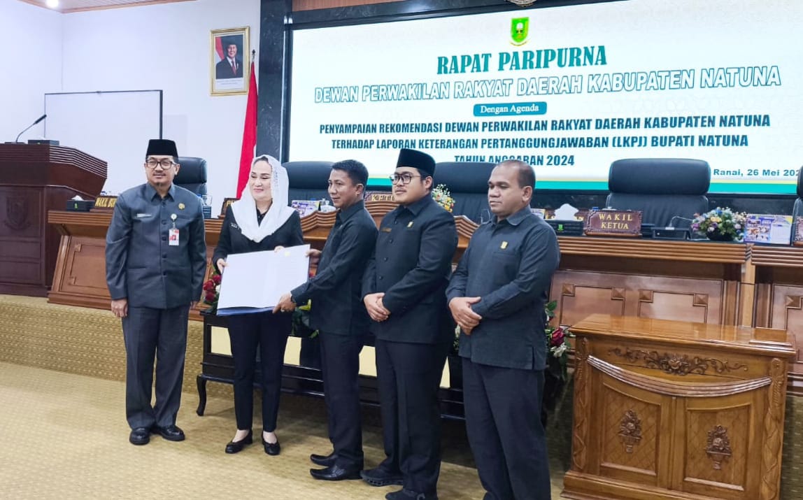 Ranai _ www.ranaipos.com : Dewan Perwakilan Rakyat Daerah (DPRD) Kabupaten Natuna menggelar Rapat Paripurna dengan agenda penyampaian rekomendasi terhadap Laporan Keterangan Pertanggungjawaban (LKPJ) Bupati Natuna Tahun Anggaran 2024. Rapat tersebut berlangsung di Ruang Paripurna DPRD Natuna pada Senin, 26 Mei 2025.