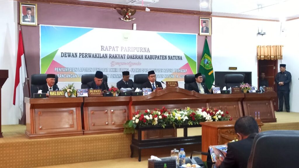 Paripurna dengan agenda Penyampaian Laporan Pendapat Akhir Fraksi-fraksi DPRD Kabupaten Natuna Terhadap Rancangan Peraturan Daerah Tentang Perubahan APBD Kabupaten Natuna Tahun 2024 Berlangsung di Kantor DPRD Kabupaten Natuna, Jalan Yos Sudarso, Kecamatan Bunguran Timur, Ranai, Senin (19/08/2024) pagi.