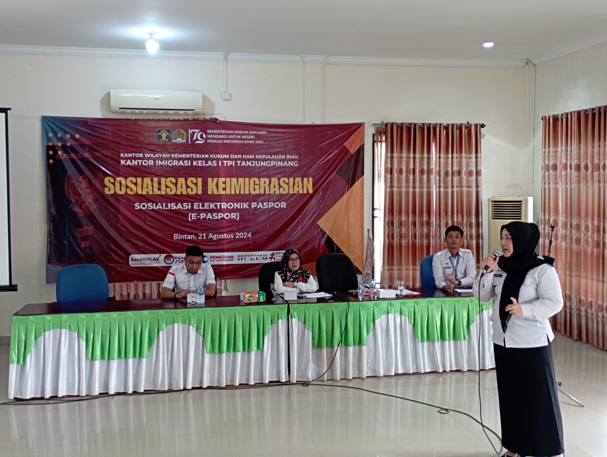 www.ranaipos.com – Bintan : Kanwil Kemenkumham Kepri melalui Kantor Imigrasi Kelas I TPI Tanjungpinang menggelar sosialisasi terkait keimigrasian dengan tema “Sosialisasi Elektronik Paspor (E-Paspor)” di Aula Kantor Kecamatan Bintan Timur, Rabu (21/08/2024).