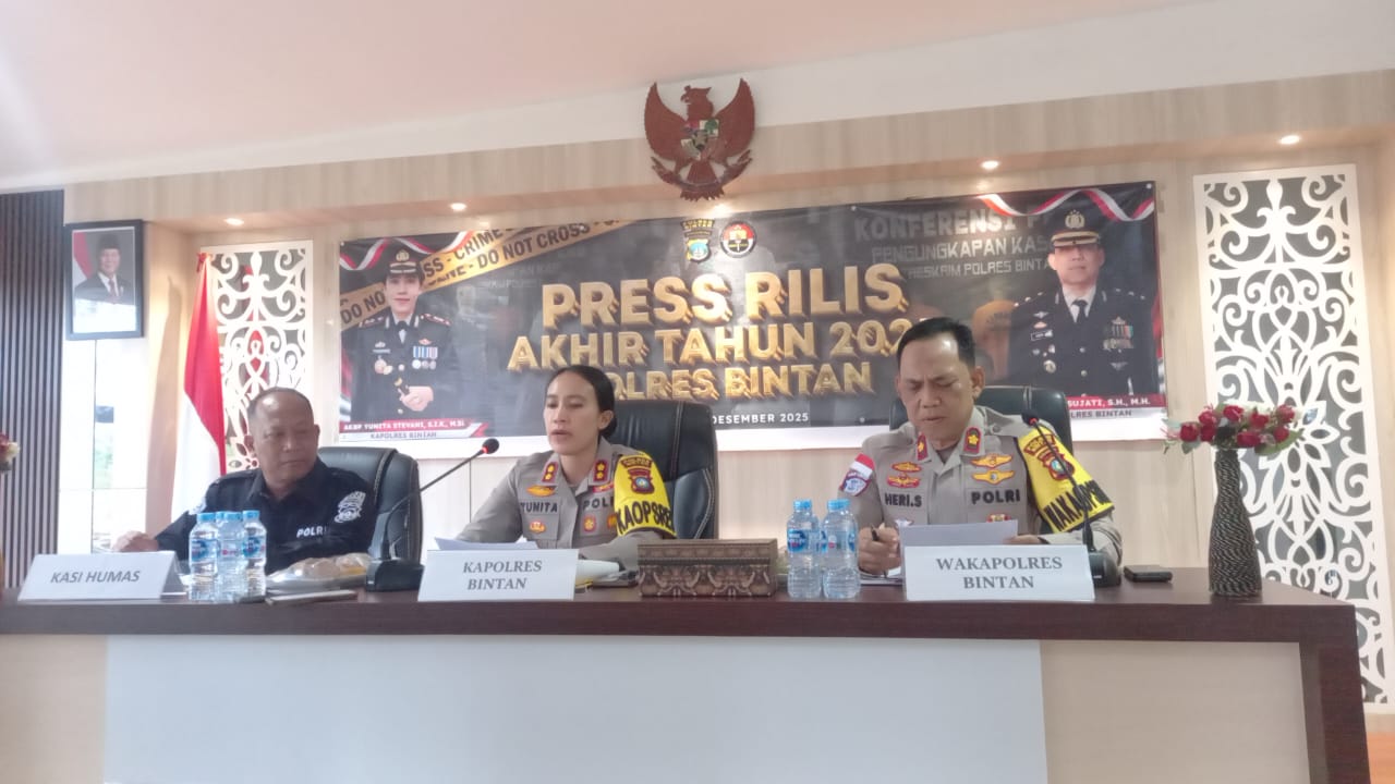 www.ranaipos.com – Bintan : Polres Bintan menggelar press release akhir tahun 2025 di Mapolres Bintan pada akhir Desember 2025. Kegiatan tersebut dipimpin langsung oleh Kapolres Bintan AKBP Yunita Stevani, S.T.K., M.Si., didampingi Wakapolres Bintan Kompol Eri Sujati, S.H., M.H., serta Kasi Humas Polres Bintan IPTU Hotma Panusuna Oliver Lolos Bako.