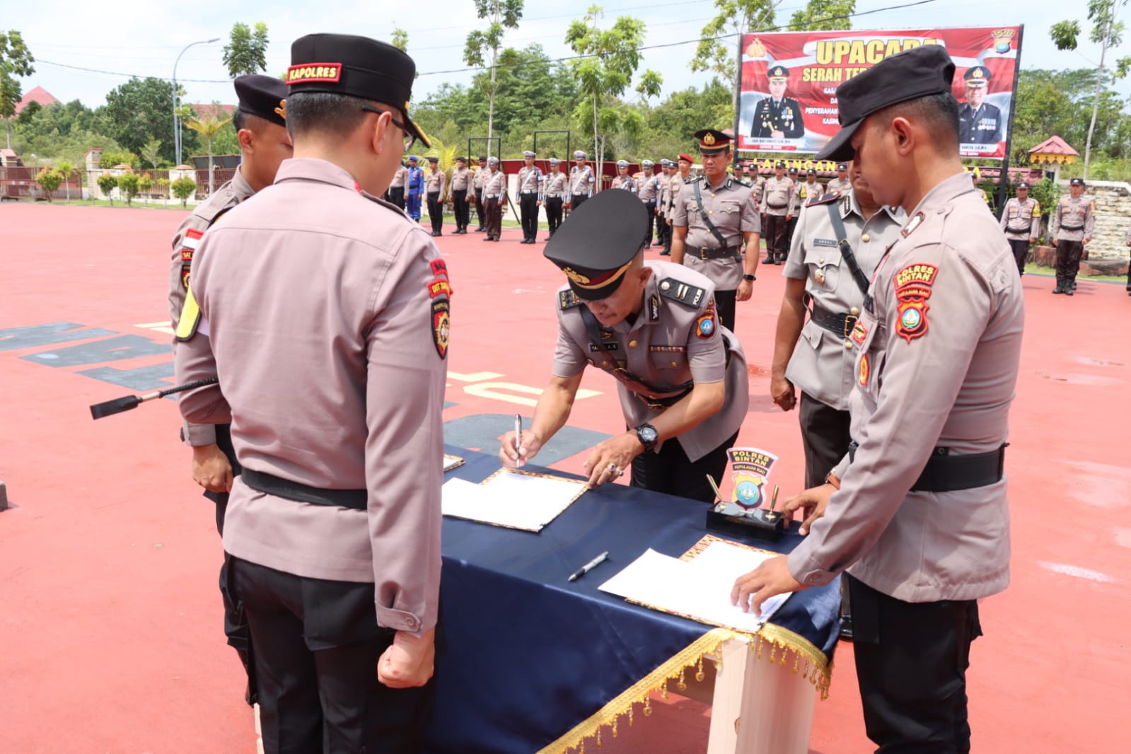 Kapolres Bintan mengucapkan selamat kepada para pejabat yang baru dilantik, serta menyampaikan apresiasi atas dedikasi pejabat sebelumnya selama bertugas di Polres Bintan.