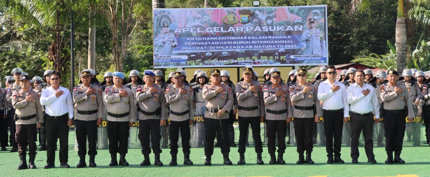 www ranaipos.com _ Natuna : Kapolres Natuna AKBP Novyan Aries Efendie, SH, S.I.K, M.M, M.Tr.Opsla memimpin langsung apel gelar pasukan dalam rangka kesiapsiagaan pengamanan peringatan Hari Buruh Internasional (May Day) yang jatuh pada 1 Mei 2025.