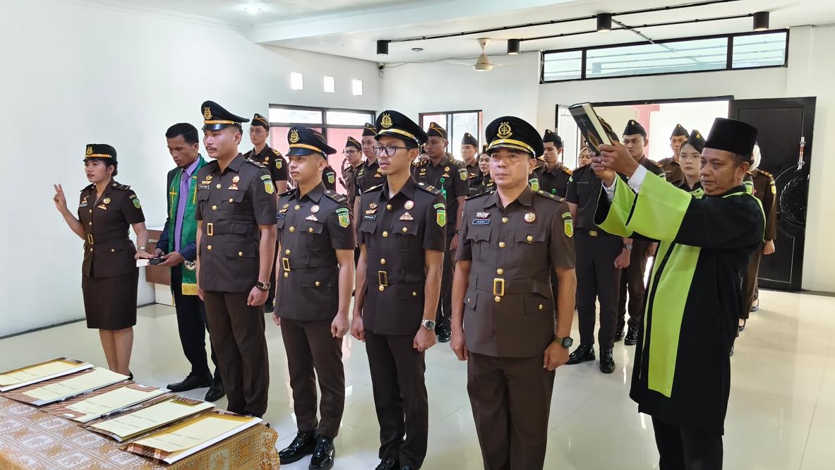 Prosesi pelantikan berlangsung khidmat, diawali pembacaan Surat Keputusan Jaksa Agung RI, dilanjutkan pengambilan sumpah jabatan, penandatanganan berita acara, dan penyematan tanda jabatan.