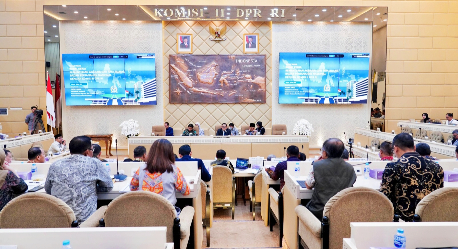 ”Rapat berlangsung di Ruang Rapat Komisi II DPR RI di Jakarta. Lebih lanjut, Rapat Kerja ini membahas topik-topik seperti evaluasi Reforma Agraria, legalisasi aset, kebijakan pertanahan dan tata ruang nasional, serta penyelesaian penyelesaian dan konflik pertanahan. Selain itu, ada juga diskusi mengenai Reformasi Birokrasi dan digitalisasi pelayanan pertanahan.