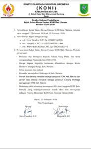 Natuna _ ranaipos.com : Komite Olahraga Nasional Indonesia (KONI) Kabupaten Natuna resmi membuka pendaftaran bakal calon Ketua Umum KONI Kabupaten Natuna periode 2026–2030. Pendaftaran dibuka mulai 12 Februari hingga 15 Februari 2026.