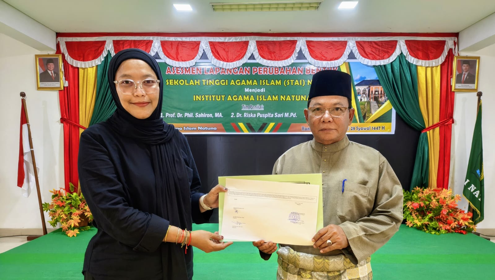 Tim penilai Dr. Riska Puspita Sari, M.Pd saat menyerahkan surat tanda telah dilaksanalannya Asesmen Lapangan Perubahan Bentuk STAI Natuna untuk menjadi Institut Agama Islam Natuna kepada Ketua STAI Natuna, Dr. H. Umar Natuna, S.Ag., M.Pd.I