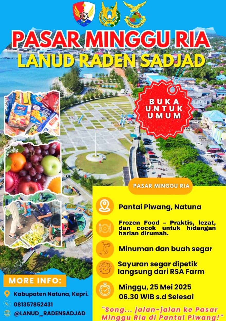ranaipos.com – Natuna : Suasana akhir pekan di Natuna akan kembali semarak dengan digelarnya Pasar Minggu Ria, sebuah kegiatan penuh keceriaan yang menggabungkan belanja, kuliner, dan dukungan terhadap pelaku UMKM lokal. Event yang telah dinanti ini kembali hadir berkat kolaborasi solid dari berbagai unsur di bawah jajaran Lanud Raden Sadjad (RSA).