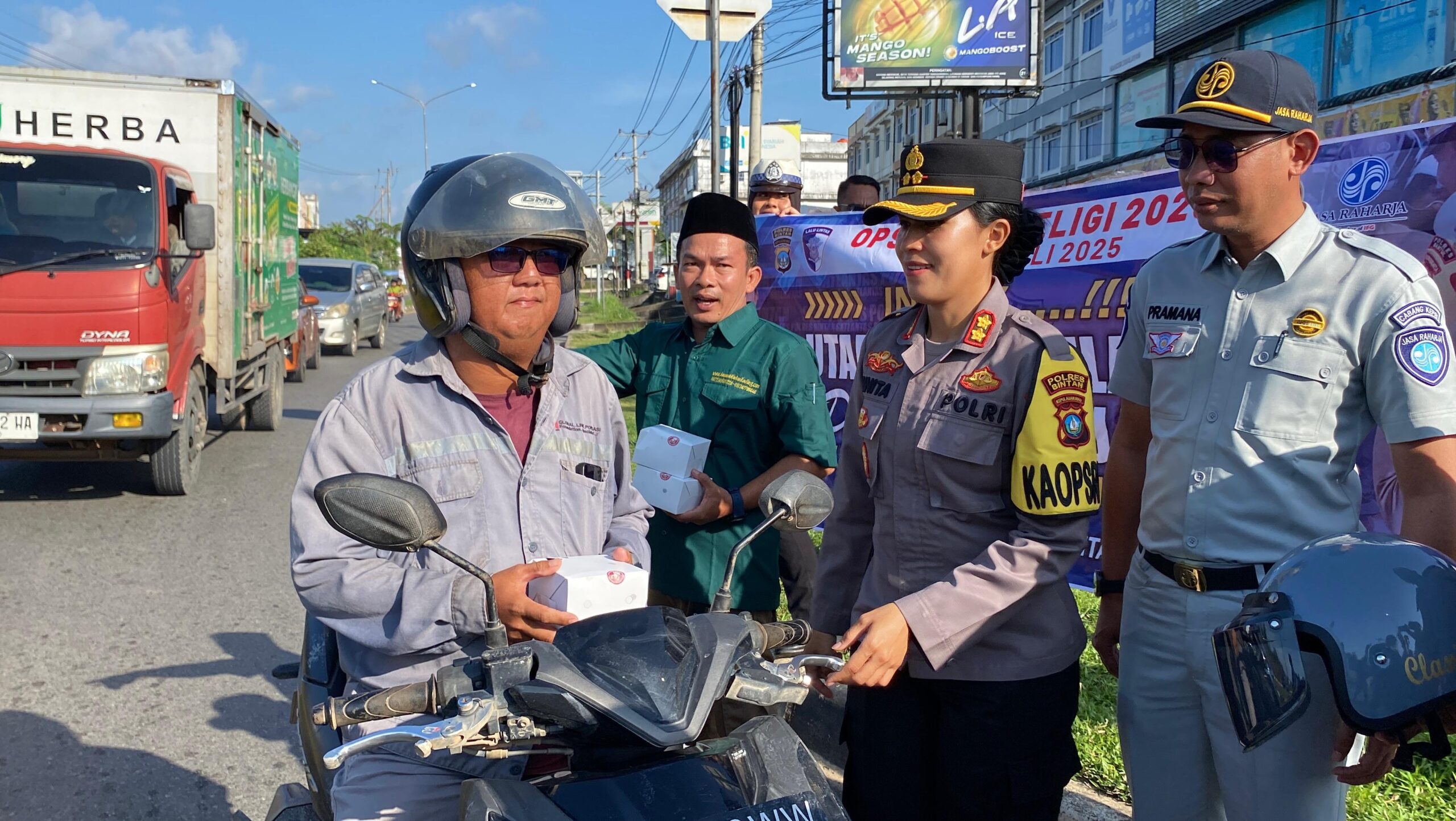 Kegiatan yang berlangsung di simpang KM.16 Desa Toapaya Selatan pada Jumat, 18 Juli 2025 ini, bertujuan untuk berbagi kebaikan kepada warga. Dalam kegiatan tersebut, Polres Bintan membagikan makanan, helm SNI, brosur penindakan Ops Patuh Seligi serta pemasangan stiker pelopor keselamatan berlalulintas kepada pengendara dan masyarakat yang melintas.