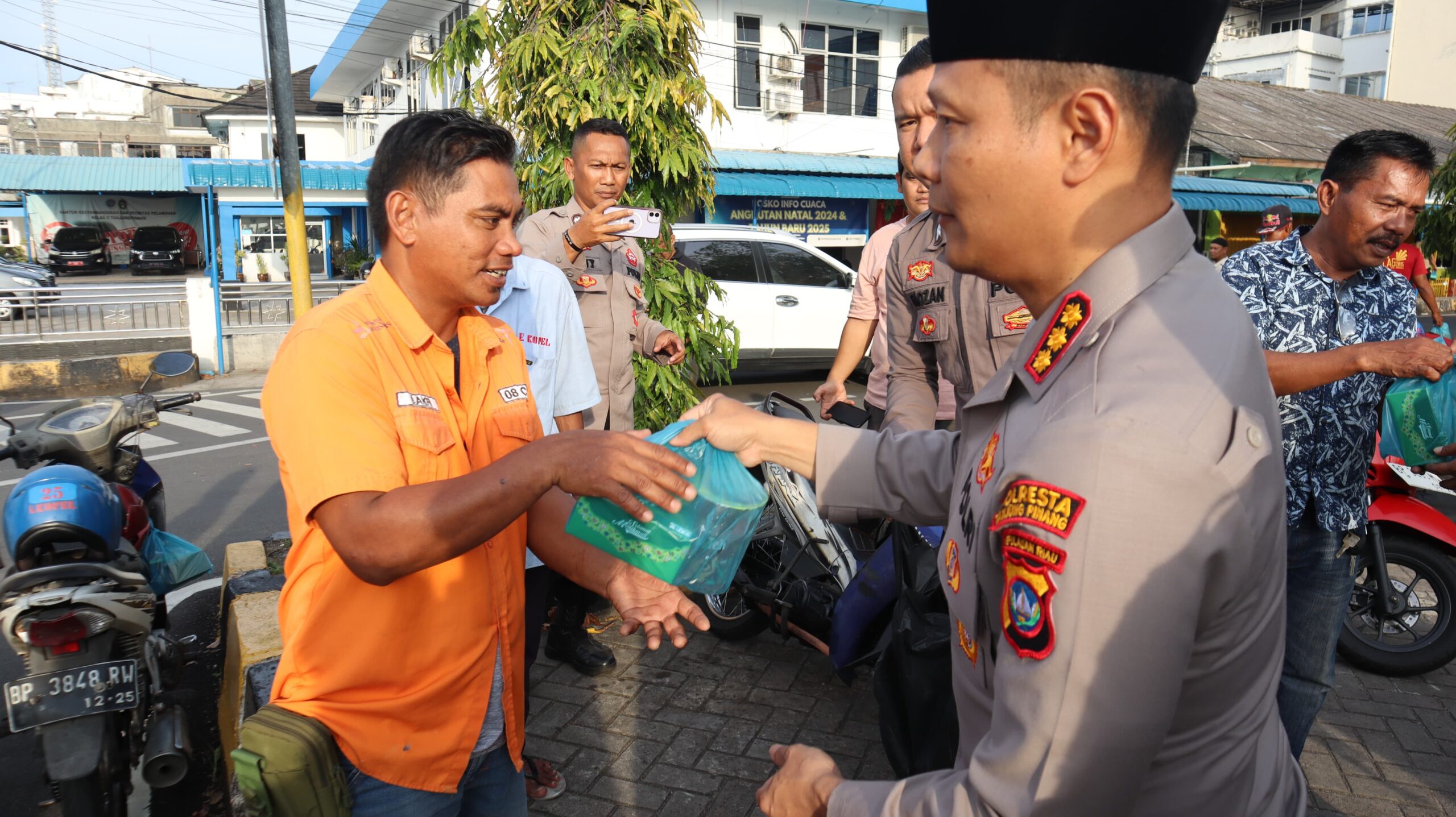 www.ranaipos.com – Tanjungpinang : Kapolresta Tanjungpinang, Kombes Pol Hamam Wahyudi, S.H., S.I.K., M.H., bersama jajaran Pejabat Utama (PJU) Polresta Tanjungpinang dan para Kapolsek, menggelar kegiatan berbagi takjil kepada masyarakat di Pelabuhan Sri Bintan Pura, Selasa (4/3/2025).