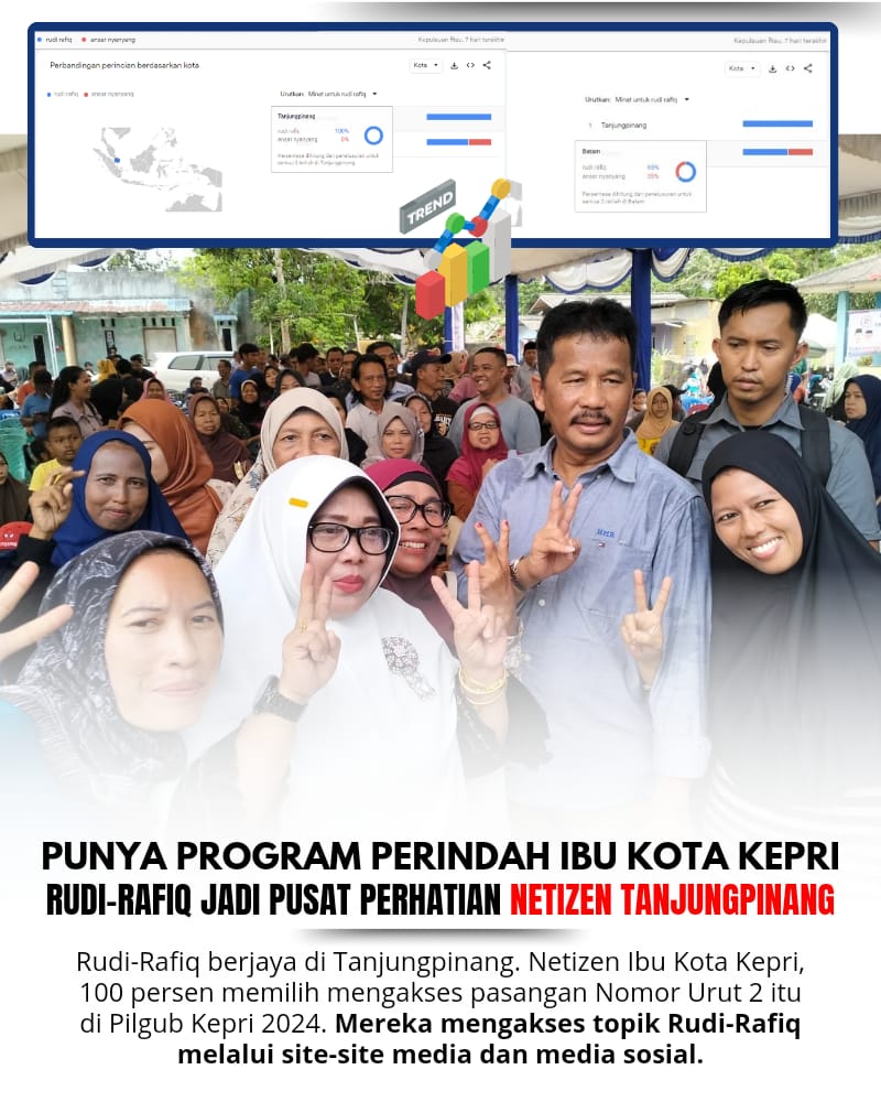 www.ranaipos.com , Tanjungpinang : Pasangan calon Gubernur dan Wakil Gubernur Kepri, Rudi-Rafiq, berhasil menarik perhatian netizen di Tanjungpinang. Berdasarkan data dari Google Trends. 100 persen netizen di Ibu Kota Kepulauan Riau memilih untuk mengakses topik terkait pasangan nomor urut 2 tersebut di Pilgub Kepri 2024, Kamis (17/10/2024).