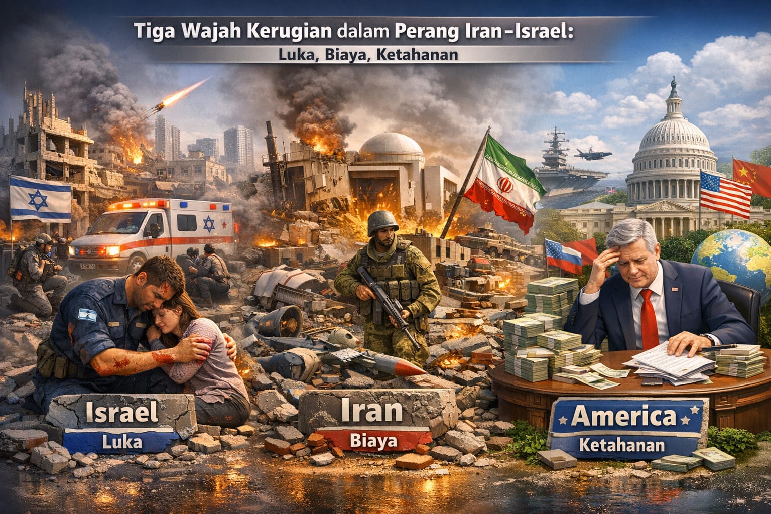 Perang antara Israel dan Iran pada 2026 bukan sekadar benturan dua kekuatan regional. Ia adalah panggung tempat tiga aktor utama—Israel, Iran, dan Amerika Serikat—menanggung kerugian dalam bentuk yang berbeda-beda: ada yang berdarah di garis depan, ada yang membayar mahal dari belakang, dan ada pula yang luluh secara fisik namun tetap bertahan secara strategis.